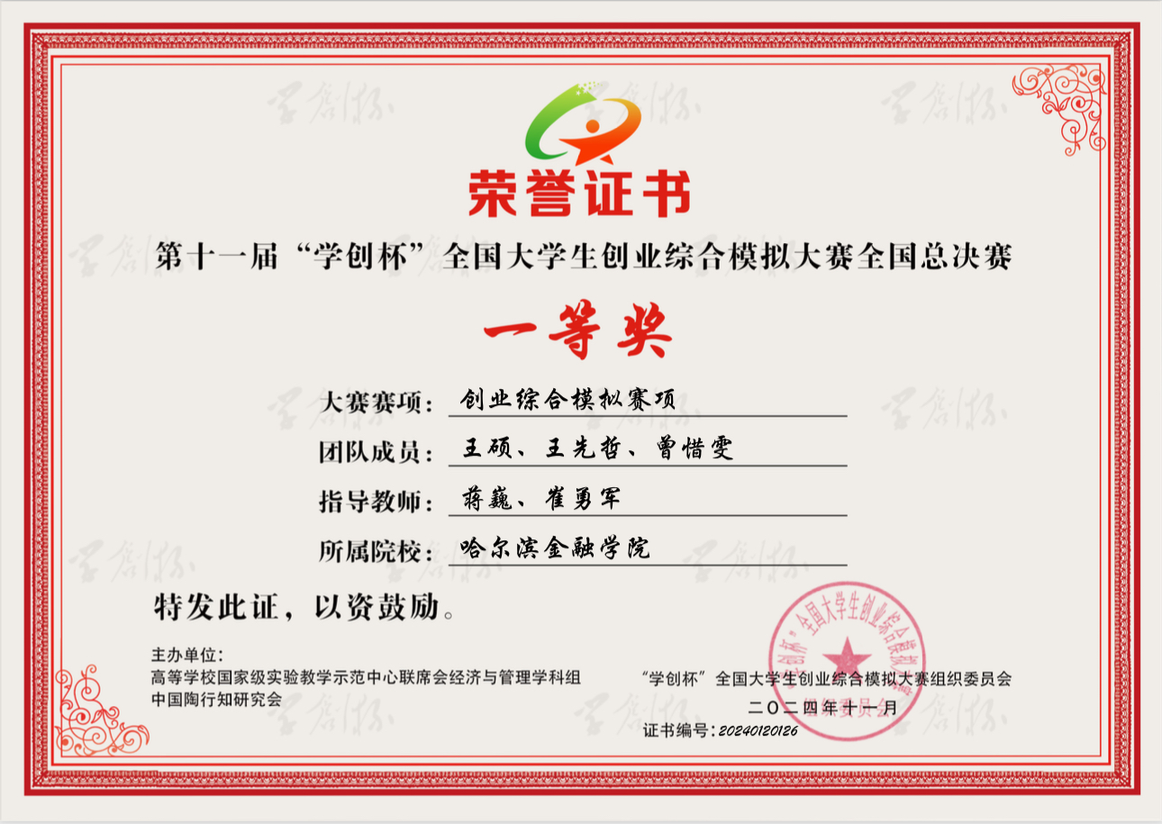 2024年11月2日,第十一届“学创杯”全国大学生创业综合模拟演训活动总决赛在徐州医科大学隆重举行。由管理学院教师刘雅晶指导,管理学院学生孙铭遥、李晶莹、白雨组成的“五月天小舞台第一排”团队;由计算机与数学学院教师蒋巍、商务英语学院教师崔勇军指导,商务英语学院学生王硕、曾惜雯,金融与贸易学院学生王先哲组成的“海绵baby”团队,在全国总决赛中与武汉大学、哈尔滨工业大学、吉林大学等一百余支参赛队伍展开激烈角逐,双双斩获创业综合模拟赛项全国总决赛一等奖,这是继2023年该项赛事后,再次获得全国总决赛两项一等奖。