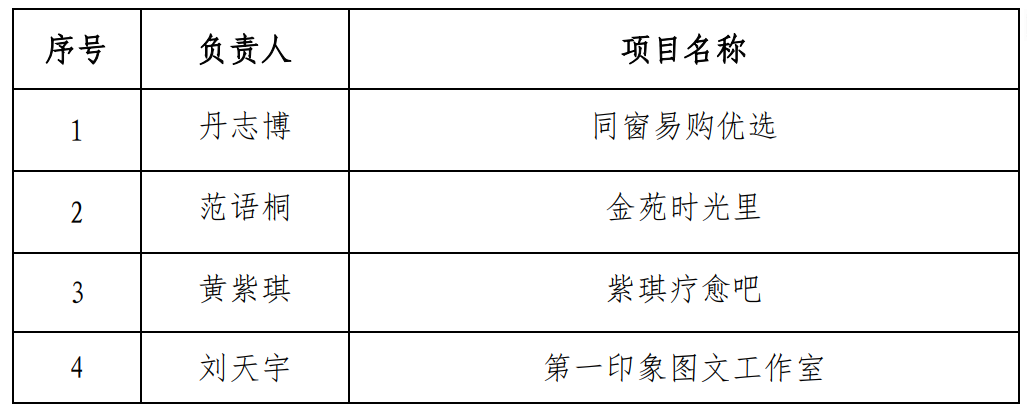 按照《哈尔滨金融学院大学生创业园管理办法》要求,经2025年11月24日第二批大学生创业园入驻项目路演校外专家评审、12月4日学校大学生创新创业教育工作领导小组2025年第一次会议审议,拟推荐4个申请项目为2025年第二批大学生创业园入驻项目。现予以公示: